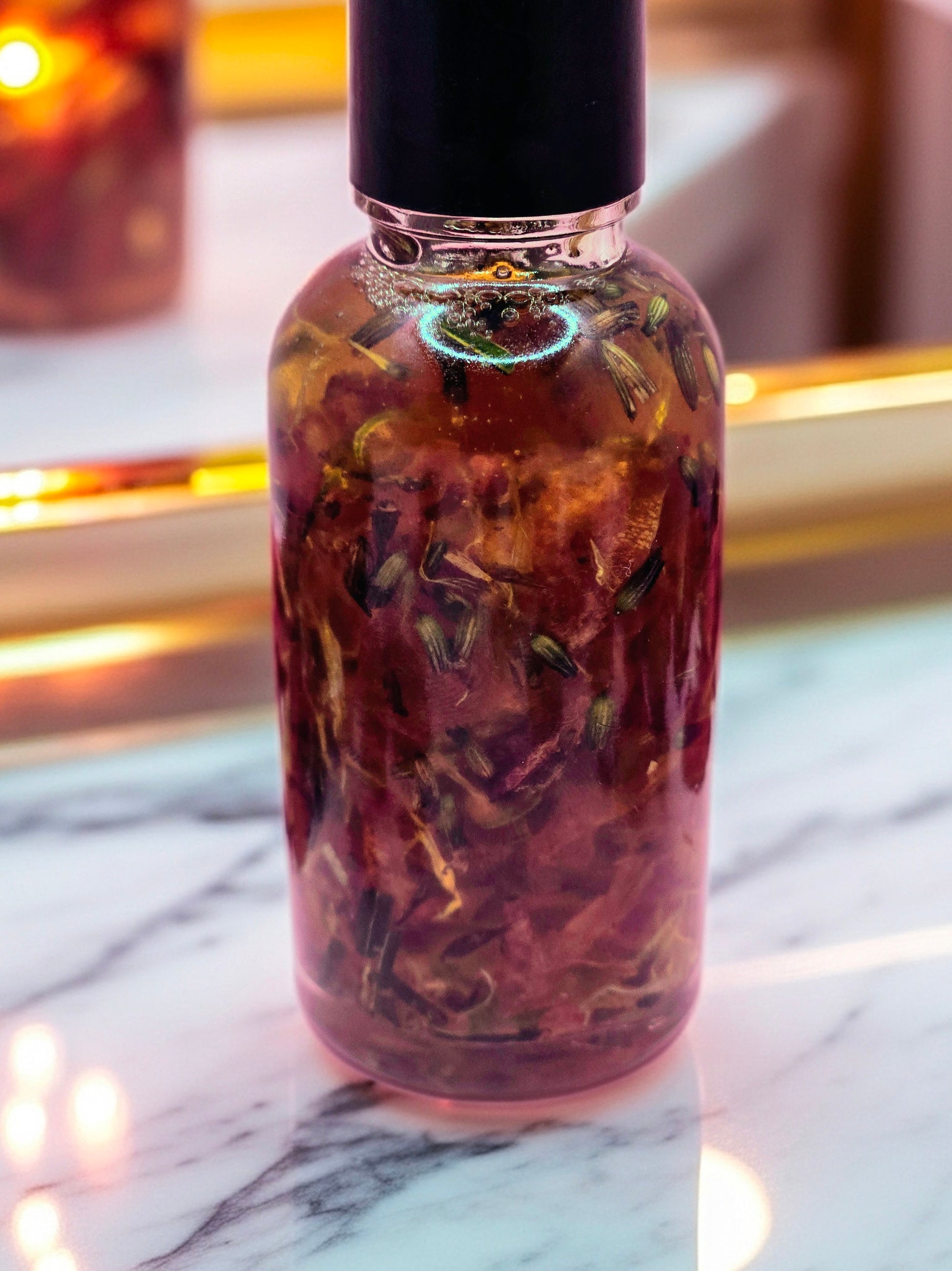 Ingredients: Squalane (olea europaea), Rosehip Seed (rosa rugosa), Sea Buckthorn (hippophae rhamnoides), Vitamin E Booster (tocopherol), with floating dried lavender, calendula and rose petals, gentle rose scent (Vitamin A, Vitamin C, Vitamin E, Omega-3, Omega-6, Omega-7, Omega-9, gamma-linoleic acid (GLA)) (Anti-inflammatory, Antioxidant, Antiseptic)
